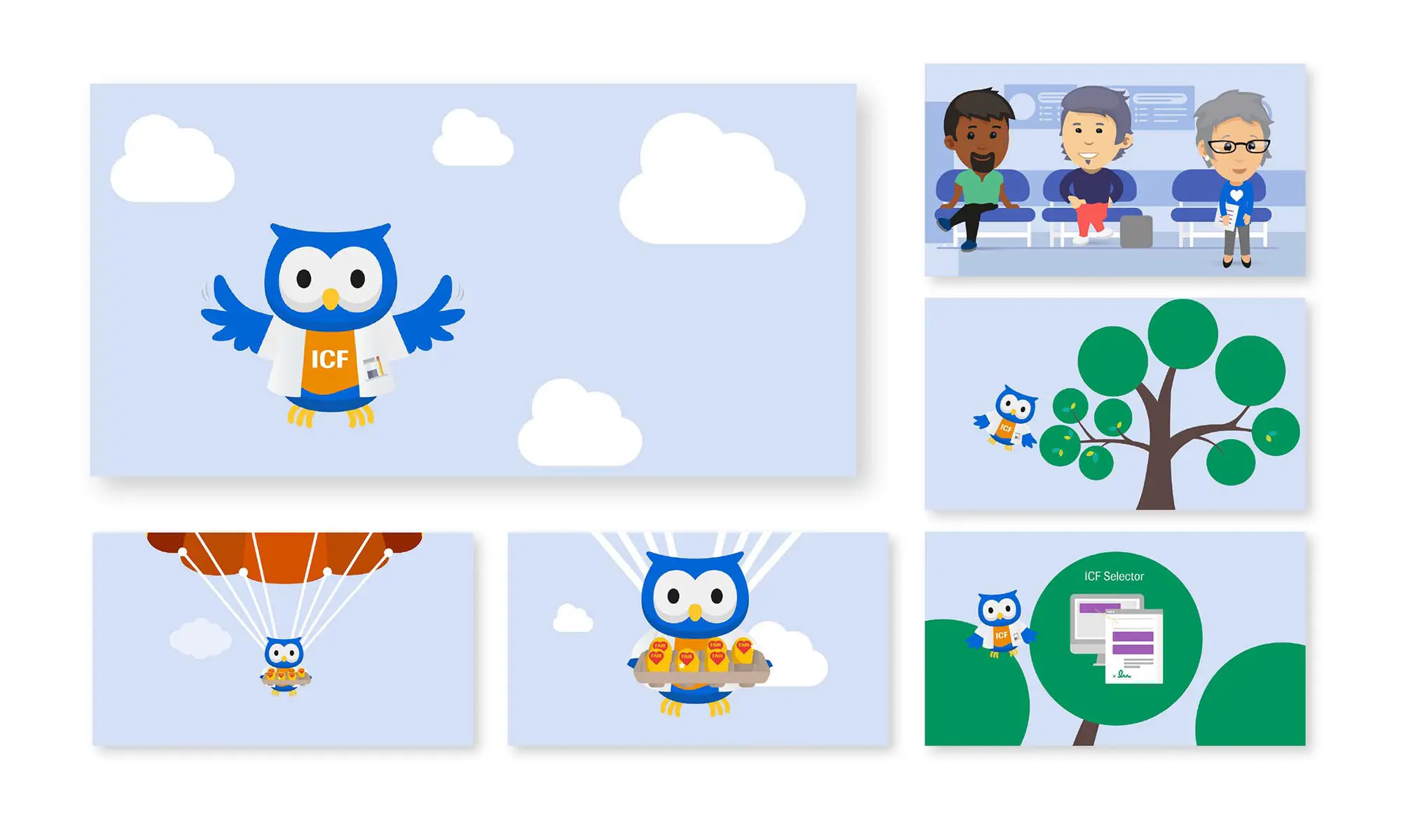 Ollie the Owl animation – Design of full storyboard (with all assets for animator) for three-minute eLearning animation unpacking the benefits of a new client program.